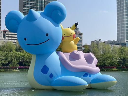 석촌호수 동호에는 높이 16m, 폭 18m의 메타몽 버전 라프라스와 피카츄 벌룬이 설치되어 방문객들의 시선을 단번에 사로잡습니다. 밤에는 조명이 켜져 야경과 함께 환상적인 모습을 연출합니다.