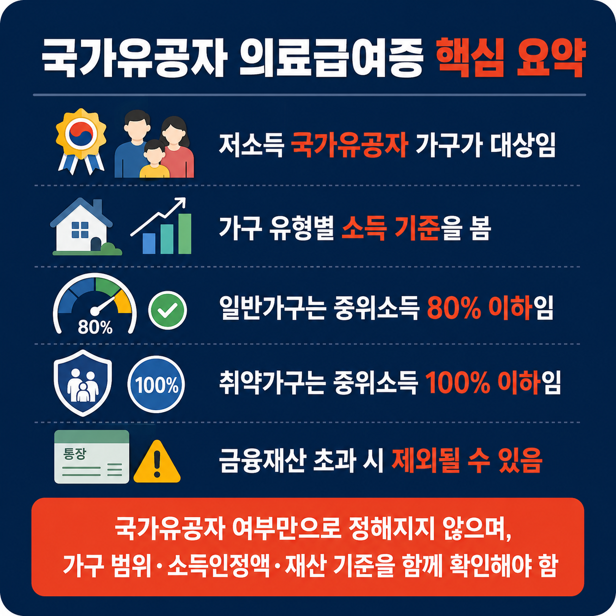 경고 국가유공자라고 해서 모두 의료급여증이 발급되는 것은 아닙니다. 가구 유형별 소득 기준과 재산 기준을 반드시 확인해야 합니다. ❗