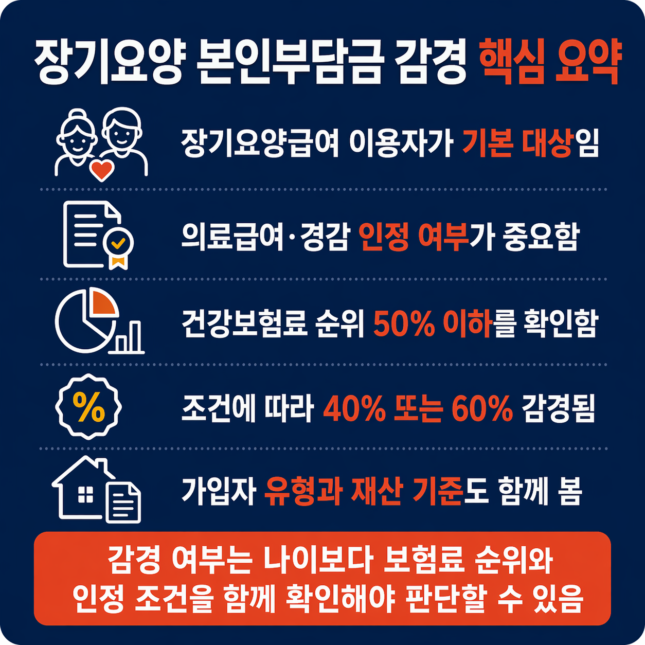| 핵심 조건 | 건강보험료 순위, 가입자 유형, 재산 기준, 의료급여 또는 본인부담액 경감 인정 여부 확인 필요 🔍 |