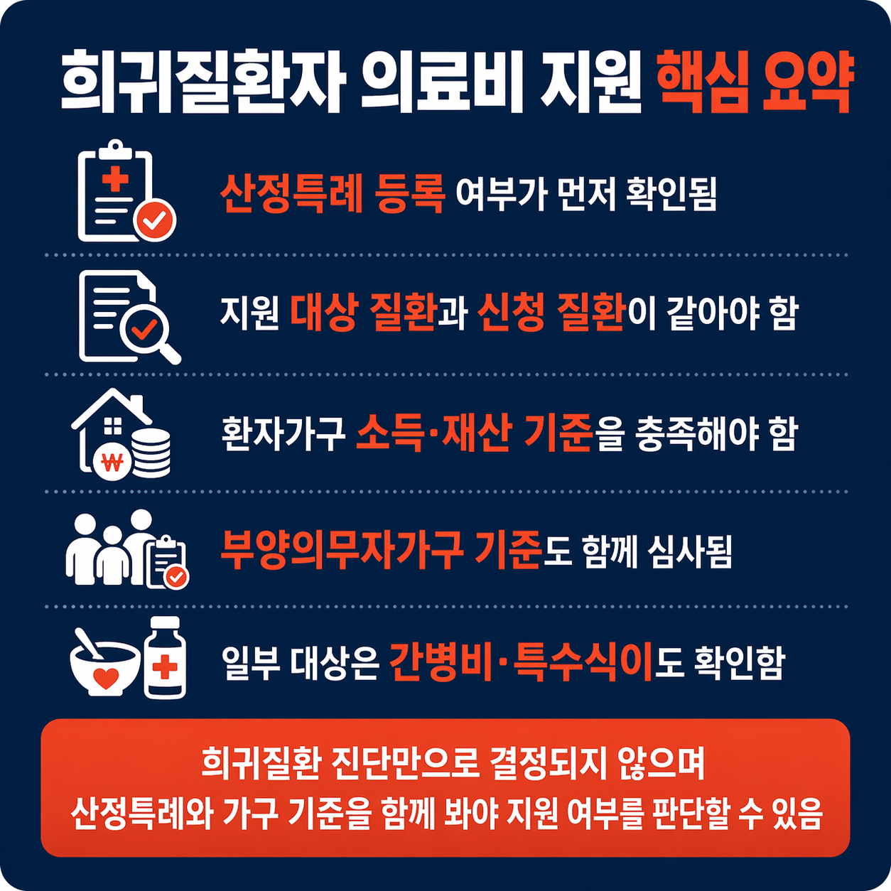 경고 희귀질환 진단을 받았다고 해서 바로 지원되는 것은 아닙니다. 반드시 산정특례 등록, 질환 해당 여부, 소득·재산 기준을 함께 확인해야 합니다. ❗